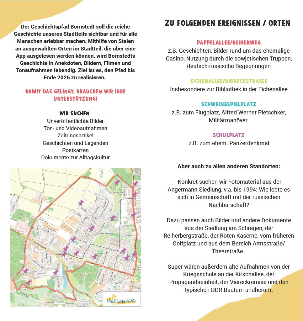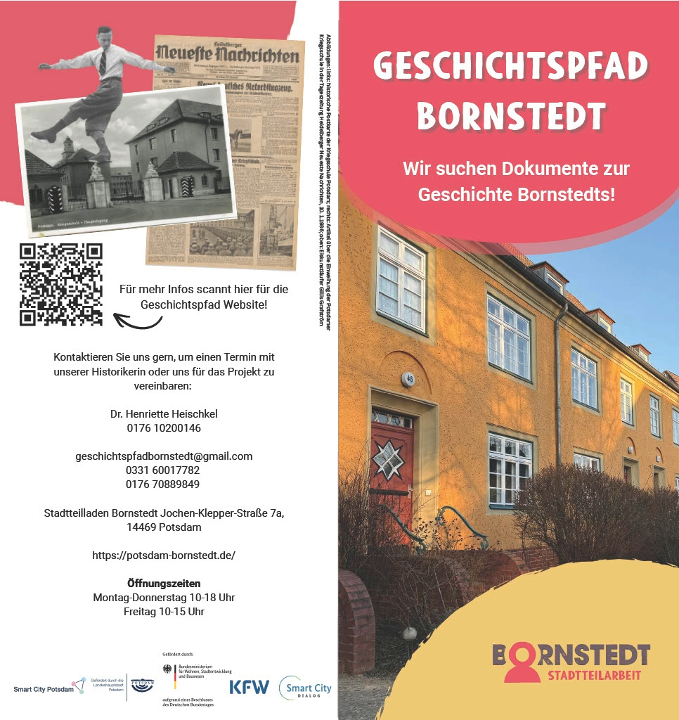 Möchten Sie mitmachen? Wir suchen noch (Familien-)Geschichten, Zeitzeugenberichte und historische Dokumente wie Fotos oder Postkarten, die Bornstedts Vergangenheit zeigen. Nehmen Sie gern Kontakt mit dem Team des Stadtteilladens auf: