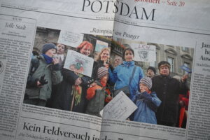 Ingrid trifft sich mit ihrem Besuch in der gemütlichen Wohnküche ihres Hauses. Vor ihr steht ein Karton randvoll mit Erinnerungen. Darin Magazine und Flyer über Potsdam, persönliche Fotobücher und ein altes Titelblatt der Potsdamer Neuesten Nachrichten. Das große Foto darauf zeigt Ingrid mit einer Gruppe von Anwohnenden der Potsdamer Straße. Gemeinsam haben sie sich 2007 für eine neue Asphaltdecke eingesetzt – mit Erfolg. Der erneuerte Straßenbelag schränkte zwar nicht den ausufernden Verkehr auf der Straße ein, die Ingrid die „Bornstedter Autobahn“ nennt. Aber zumindest wurde der Lärm etwas gedämmt.