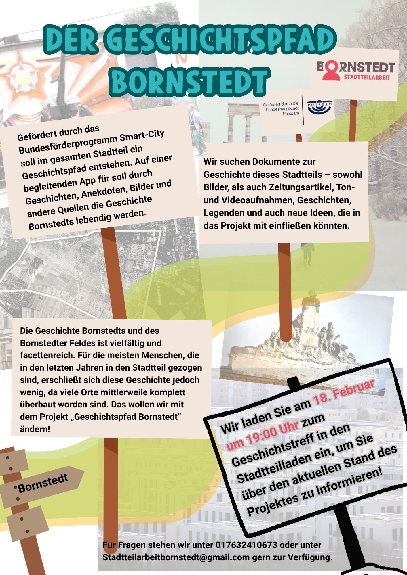 Gefördert durch das Bundesförderprogramm Smart-City soll im gesamten Stadtteil ein Geschichtspfad mit Infotafeln oder Stelen entstehen, auf denen die wichtigsten historischen Informationen zu den jeweiligen Orten zusammengefasst sind. Auf einer begleitenden App für mobile digitale Endgeräte (Smartphones und Tablets) soll durch Geschichten, Anekdoten, Bilder und andere Quellen die Geschichte Bornstedts lebendig werden.